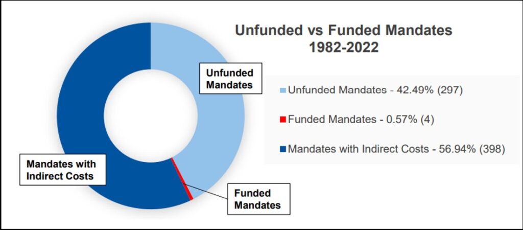 In 2023, Illinois Association of School Boards reported that of the 699 mandates that have been sanctioned on Illinois schools since 1982, only 4 of those have been directly funded. Almost half of all mandates come with additional regulations and responsibilities for educators without any funding or legislative support. The rest are “mandates with indirect costs”, this means that they are not directly funded but are expected to recover costs through existing financial aid programs such as Evidence-Based Funding. Bottom line, Illinois legislators have been stacking schools with regulations and increasing costs without any support leaving you, the taxpayer, to make up the difference with your property taxes.